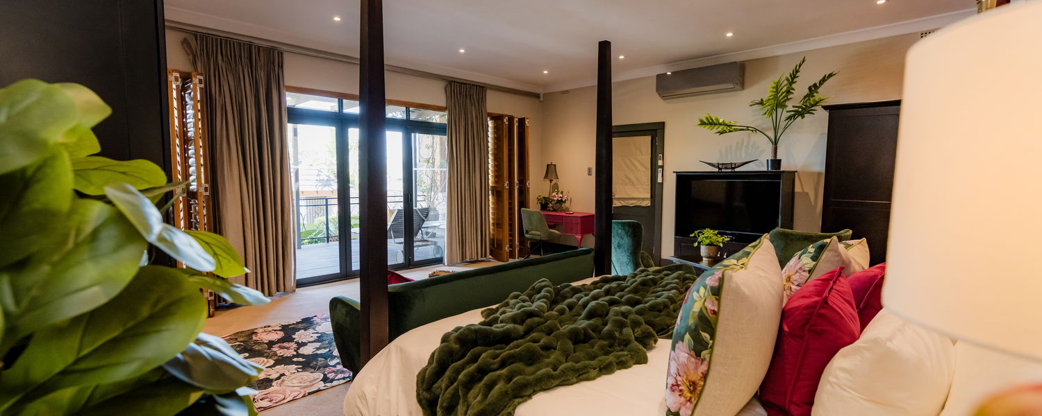 It has a king size 4 poster bed, elegant 2 seater couch, 2 bucket chairs, 2 giant Baroque mirrors, a dressing table and dresser, a double wardrobe, TV unit, tea/coffee station and a wood burning fireplace. An original zebra oil and a giant Nguni hide add an essence of Africa. The en-suite bathroom is the epitome of luxury tiled in ebony gloss tiles, with twin basins on a marble topped unit, a super luxurious double volume shower fully tiled in mirrored mosaics and a magnificent safari style bath, bidet and toilet.