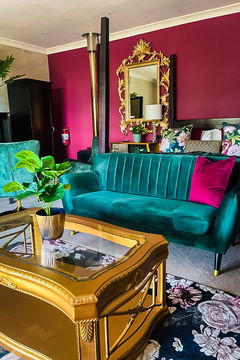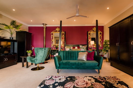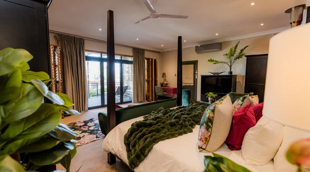 Thandi is very spacious and makes a bold statement in black, white and silver accented with heavy silver grey block out curtains over solid wood plantation shutters.