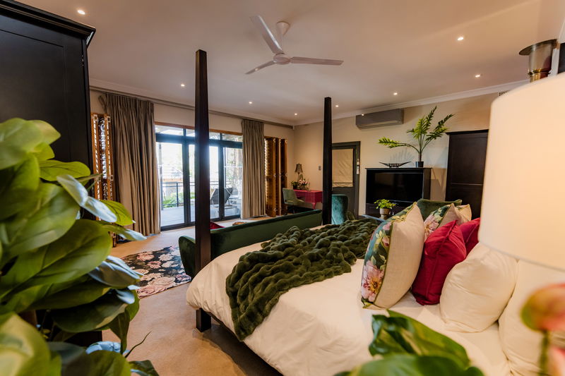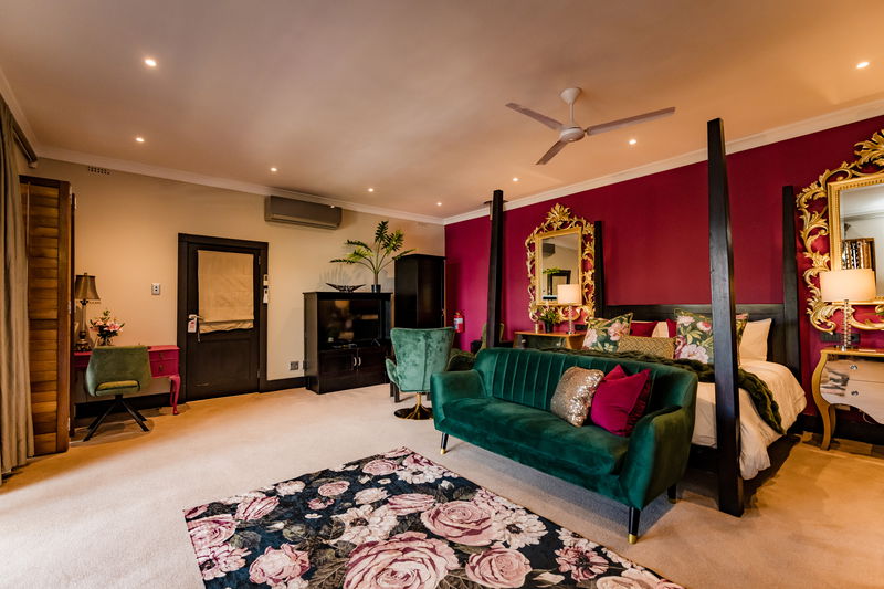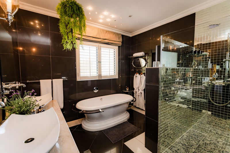 It has a king size 4 poster bed, elegant 2 seater couch, 2 bucket chairs, 2 giant Baroque mirrors, a dressing table and dresser, a double wardrobe, TV unit, tea/coffee station and a wood burning fireplace. An original zebra oil and a giant Nguni hide add an essence of Africa. The en-suite bathroom is the epitome of luxury tiled in ebony gloss tiles, with twin basins on a marble topped unit, a super luxurious double volume shower fully tiled in mirrored mosaics and a magnificent safari style bath, bidet and toilet.