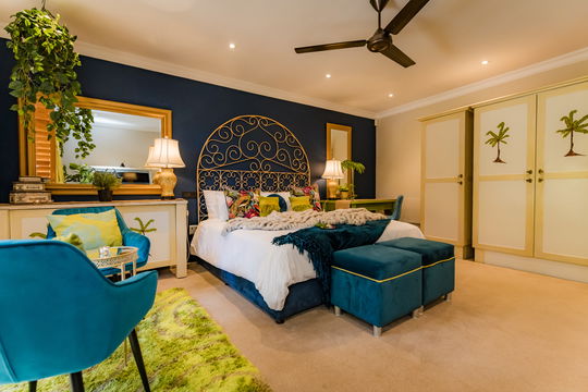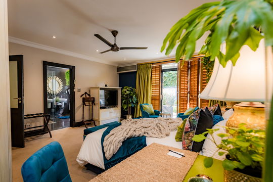The bathroom dazzles with its ebony-coloured tiles, opulent golden sunburst mirror, double basins, walk-in shower and hanging greenery. It also includes a freestanding bath, perfect for indulgent candlelit soaks.