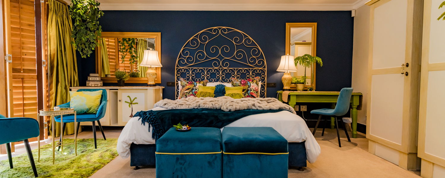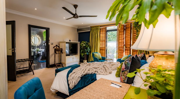 The bathroom dazzles with its ebony-coloured tiles, opulent golden sunburst mirror, double basins, walk-in shower and hanging greenery. It also includes a freestanding bath, perfect for indulgent candlelit soaks.